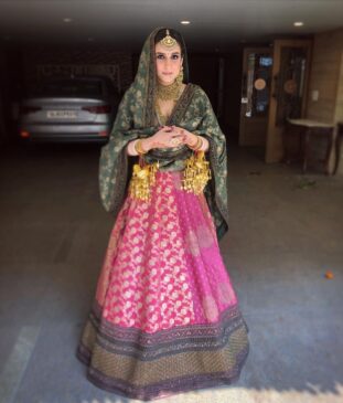 Wearing this beautiful lehenga colour combination on your wedding day will make you feel like royalty. The moss green dupatta and the rani pink skirt create such an eye-catching combination that no bride would refuse it.